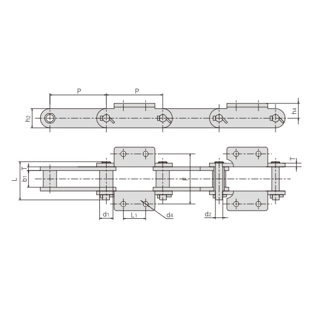 - تتكون من دبابيس وبكرات وألواح سلسلة داخلية وألواح سلسلة خارجية وألواح توصيل على شكل حرف L.
