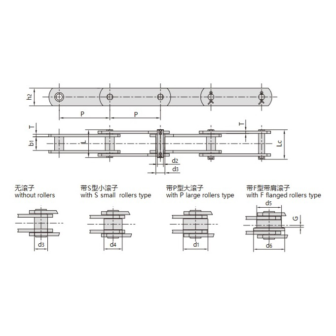 • بكرة صغيرة من النوع S:قطر الأسطوانة أصغر من ارتفاع لوحة التوصيل، مما يحمي أسنان العجلة المسننة وأكمام السلسلة؛ تستخدم عادة في أنظمة الرفع بالخطاف.